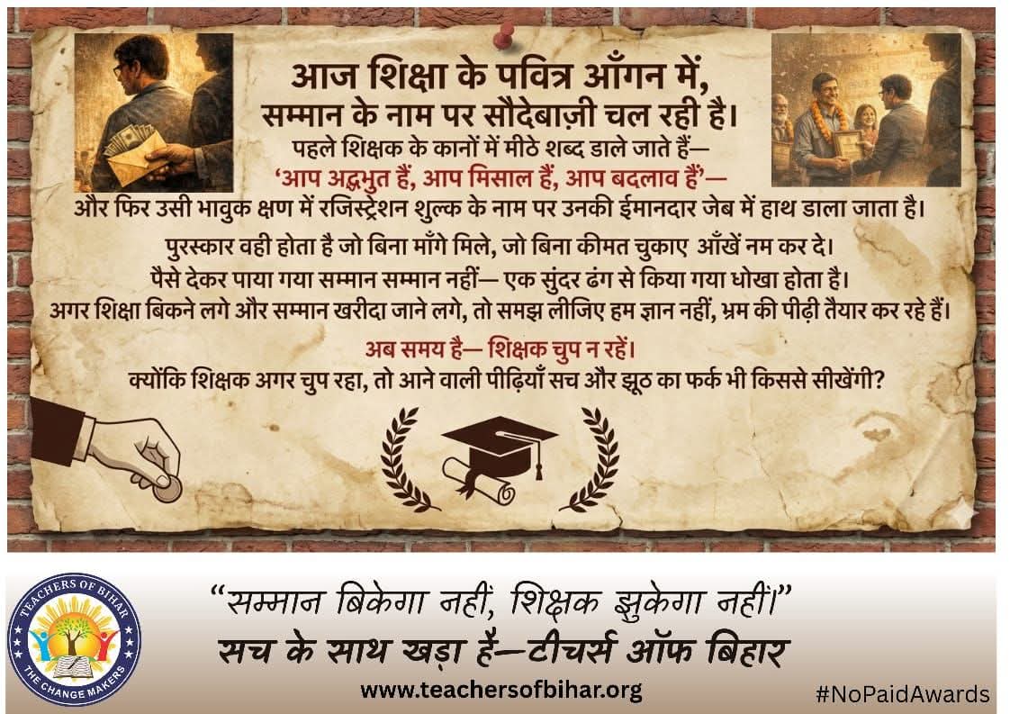 टीचर्स ऑफ बिहार के फाउंडर शिव कुमार एवं टेक्निकल टीम लीडर ई. शिवेंद्र प्रकाश सुमन ने कहा कि शिक्षा के क्षेत्र में सम्मान को व्यापार बनाना न केवल शिक्षकों का अपमान है, बल्कि यह पूरे समाज की मूल्य-व्यवस्था पर सीधा हमला है। उन्होंने कहा कि जो संगठन पैसे लेकर पुरस्कार देते हैं, वे शिक्षा की सेवा नहीं, बल्कि उसका शोषण कर रहे हैं।