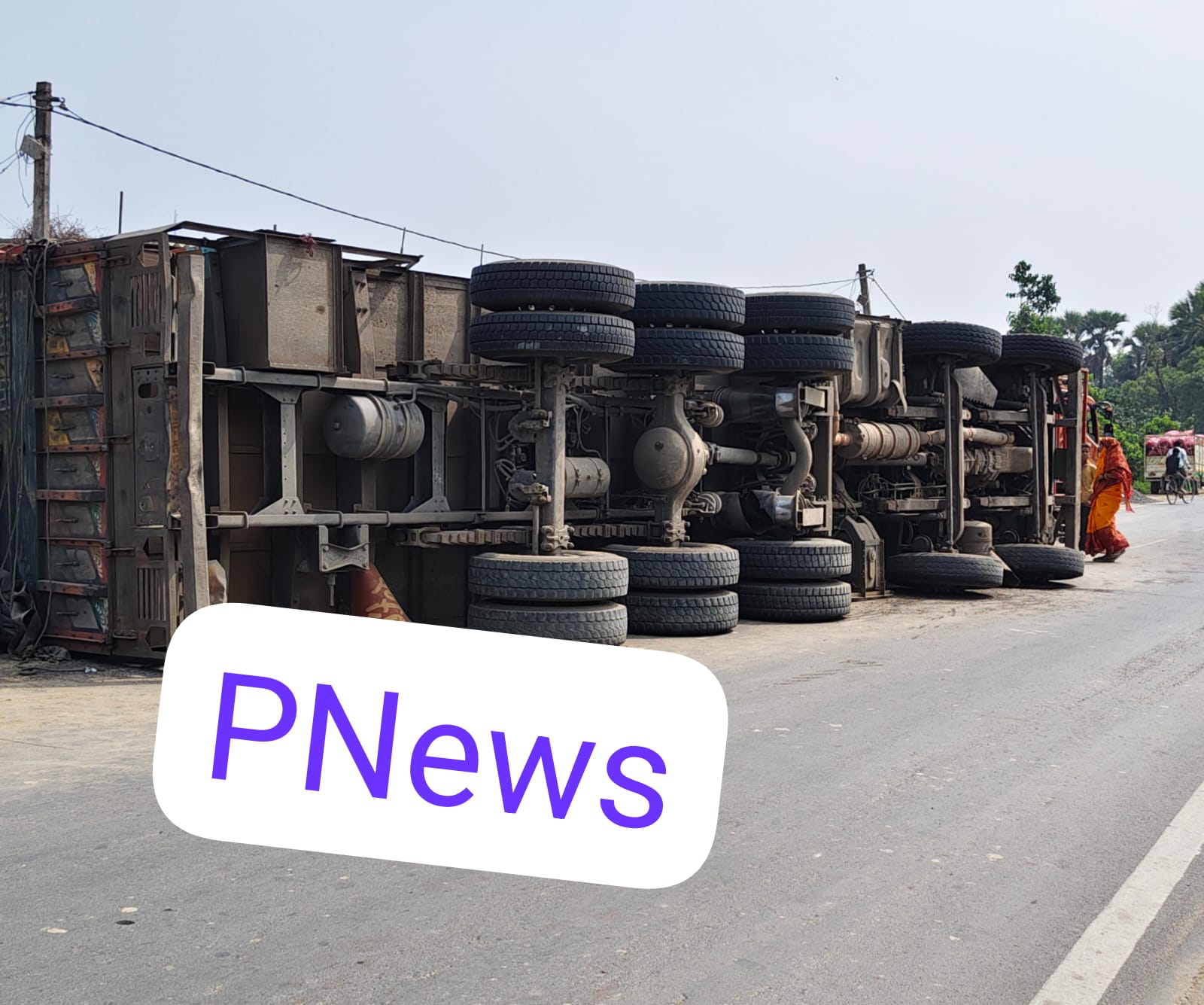 सिंघिया में भीषण ट्रक हादसा, सड़क हुई संकीर्ण—चालक बाल-बाल बचा