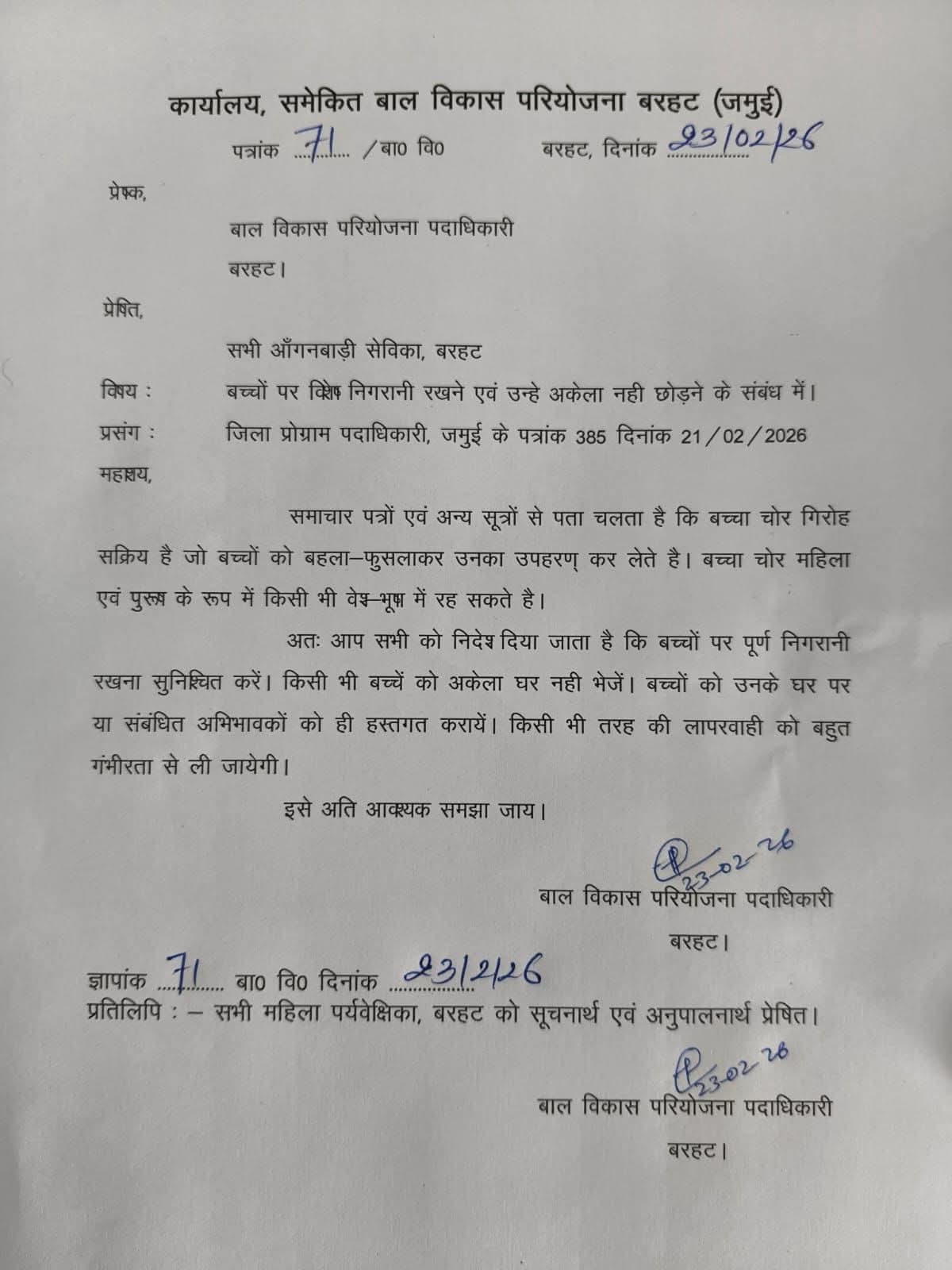 जमुई (बरहट): समेकित बाल विकास परियोजना, बरहट (जमुई) कार्यालय ने सभी आंगनवाड़ी सेविकाओं को बच्चों की सुरक्षा को लेकर सख्त निर्देश जारी किए हैं। जारी पत्र में कहा गया है कि समाचार पत्रों और अन्य स्रोतों से जानकारी मिली है कि बच्चा चोरी गिरोह सक्रिय है, जो बच्चों को बहला-फुसलाकर उनका अपहरण कर सकता है।