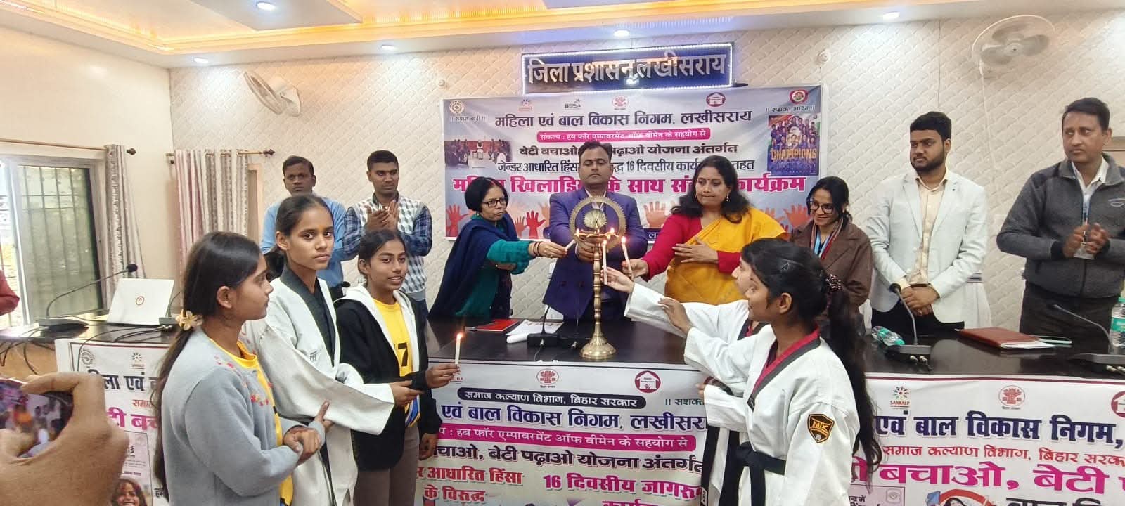 महिला एवं बाल विकास निगम, लखीसराय के तत्वावधान में जेंडर आधारित हिंसा के विरुद्ध चल रहे 16 दिवसीय अभियान के तहत महिला खिलाड़ियों के साथ संवाद कार्यक्रम का आयोजन समाहरणालय स्थित मंत्रणा कक्ष लखीसराय किया गया। कार्यक्रम की शुरुआत जिला पदाधिकारी श्री मिथिलेश मिश्र, आईसीडीएस जिला प्रोग्राम पदाधिकारी-सह नोडल पदाधिकारी मिशन शक्ति श्रीमती बंदना पांडेय, जिला खेल पदाधिकारी रवि कुमार, केंद्र प्रशासक पूनम कुमारी, जिला परियोजना प्रबंधक अरविंद कुमार राय तथा हब के जिला मिशन समन्वयक प्रशांत कुमार ने संयुक्त रूप से दीप प्रज्वलित कर की।