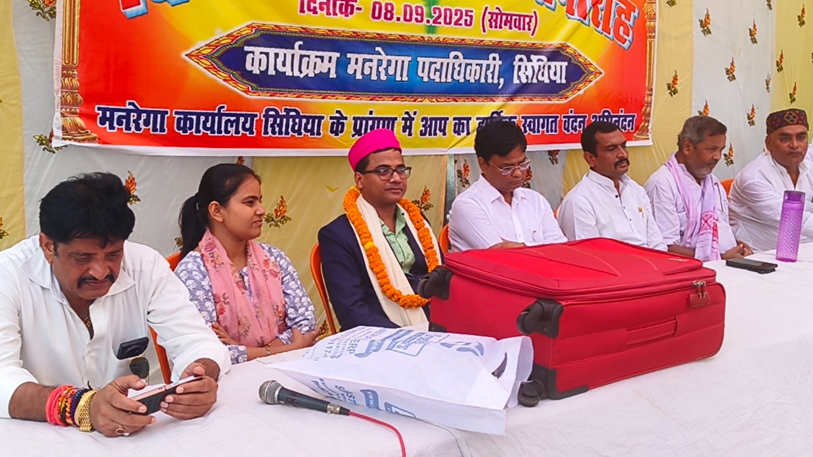 बिहार के समस्तीपुर जिले के सिंघिया प्रखंड स्थित मनरेगा कार्यालय के प्रांगन में मुखिया संघ के द्वारा विदाई सह सम्मान समारोह का आयोजन किया गया उक्त कार्यक्रम की अध्यक्षता मुखिया संघ के प्रखंड अध्यक्ष चंद्रमणि सिंह उर्फ कारू सिंह ने किया तथा मंच का संचालन फुलहरा के मुखिया पति पूर्व मुखिया सह संसद प्रतिनिधि मनोज झा ने किया ।उक्त कार्यक्रम में सिंघिया प्रखंड के मनरेगा के पी ओ डॉक्टर प्रेम कुमार लाल को नालंदा स्थानांतरण होने पर मिथिला परम्परा के अनुसार अंगवस्त्र पाग माला से सम्मानित किया गया मौके पर उपस्थित अन्य पदाधिकारी में प्रखंड विकास पदाधिकारी विवेक रंजन सीओ सरिता रानी आर ओ प्रभाकर झा के अलावे अन्य जन प्रतिनिधि को भी सम्मानित किया गया । पी ओ डॉक्टर प्रेम कुमार लाल को स्थानांतरण होने पर जनप्रतिनिधि लोगो ने अभी से ही कमी महसूस करने लगे और इनके कार्यकाल में की गई कार्य को सराहनीय बताया ।मौके पर पूर्व उप प्रमुख रौशन सिंह कौशल सिंह वार्ड पार्षद निरंजन सिंह।बीसी मो0 सोहराब आलम ,पीटीए सत्येंद्र पाठक ,राम बिनोद ,जेई अरुण कुमार ,पीआरएस बिनोद कुमार, जितेंद्र कुमार सिंह ,अमित कुमार ,अनिरुद्ध कुमार ,मुकेश रजक, राजेश वर्मा ,अरविंद कुमार ,अनिल कुमार ,नीरज कुमार ,शिव कुमार पासवान ,रणजीत कुमार ,मिलन कुमार, उमेश गिरी ,राकेश कुमार ,मुरारी ठाकुर ,नीरज कुमार झा ,सुजीत कुमार ,मुखिया प्रतिनिधि गोपाल सिंह,मुखिया राम सोगारथ यादव ,राम प्रवेश साहू ,लखी कमती ,राम कृष्ण पंडित ,राम सागर यादव ,ब्रह्मदेव यादव ,बैजनाथ सिंह ,मो खालिद गुलाब ,पंचायत समिति सदस्य अनिल कुमार पासवान ,त्रिपुरारी झा मनोज साफी के अलावे अन्य कई लोग उपस्थित थे बताते चले कि पत्रकार लोगो ने भी पी ओ प्रेम कुमार को सम्मानित करने का काम किया है।