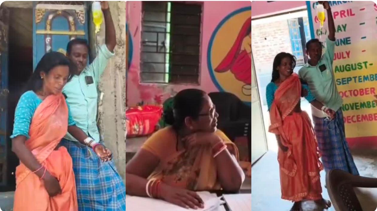 सलाइन बोतल थामे आंगनबाड़ी सेविका: वायरल वीडियो में देखा जा रहा है कि आंगनबाड़ी सेविका के पति एक हाथ से उन्हें सहारा दे रहे हैं, जबकि दूसरे हाथ में सलाइन (IV फ्लूइड) की बोतल थामे हुए हैं. यह तस्वीर सरकारी व्यवस्था में व्याप्त अमानवीय रवैये को उजागर कर रही है.